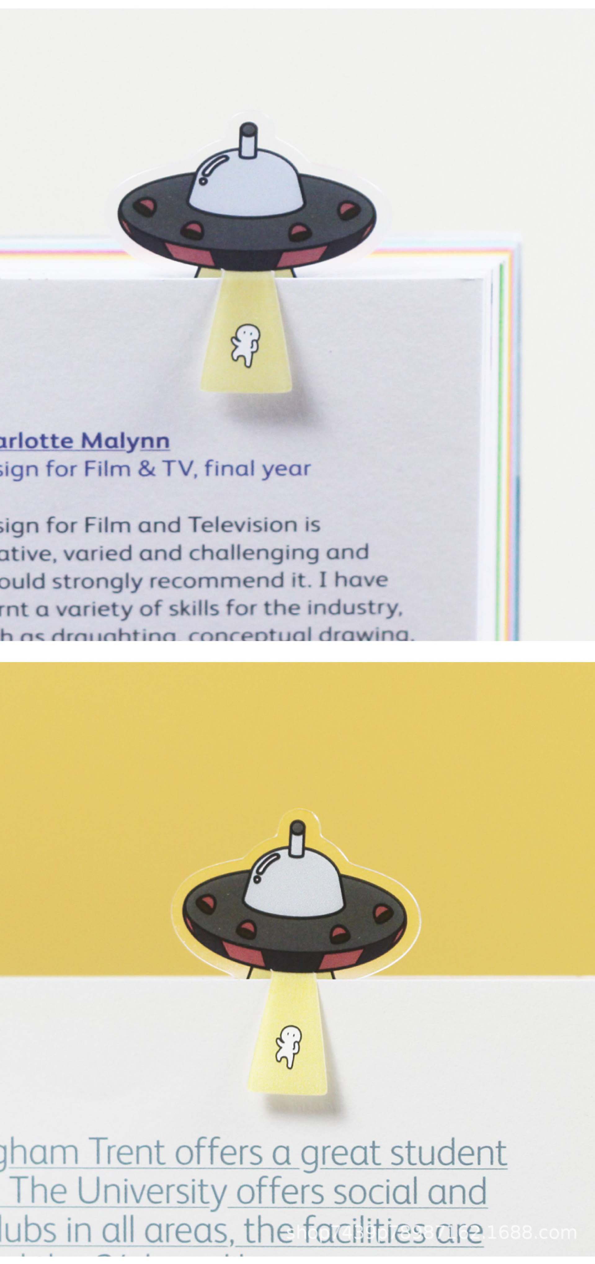 有趣又實用的宇宙飛碟創意書籤更是送禮必備佳選,可用作校慶禮品給與學生便利;用作公司禮品,幫助員工快速分類文件,提高效率;用作宣傳禮品,字母拼出公司名稱夾在宣傳單張上,加深品牌形象;