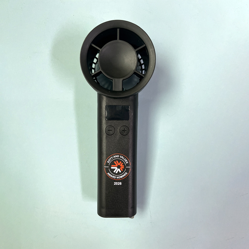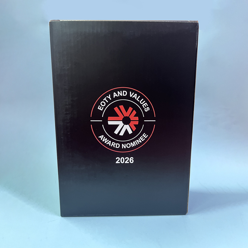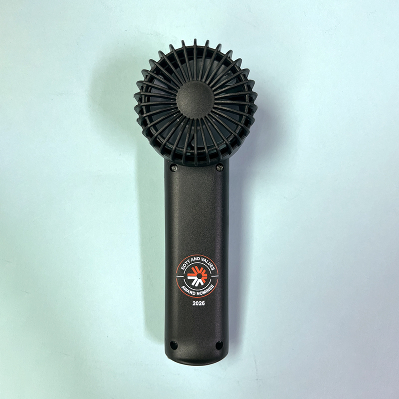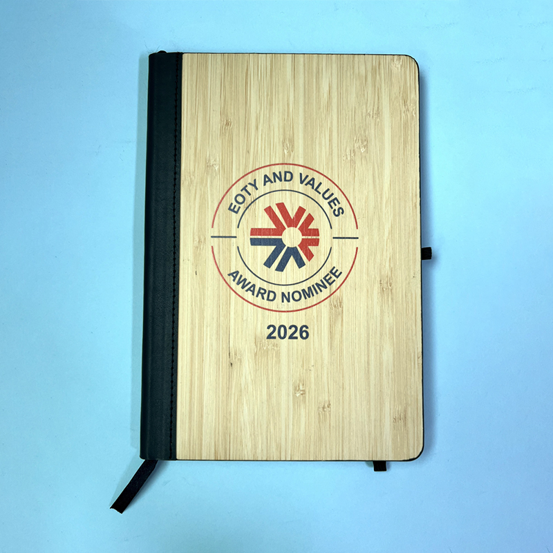 【全套品牌化整合】套組含黑色禮盒、手持風扇、木纹筆記本、金屬筆4款實用單品,全品項同步印製「EOTY AND VALUES AWARD NOMINEE 2026」與品牌標識,視覺統一強化品牌記憶點